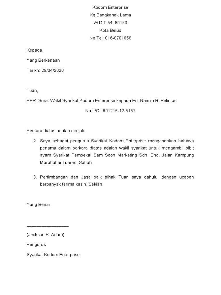 Contoh Surat Wakil Syarikat Letter 7saudara Com